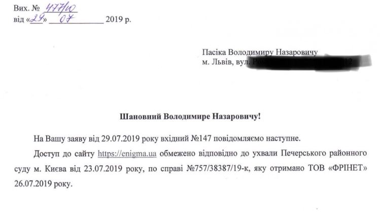 "Сегодня скандальный судья Печерского районного суда Киева Сергей Вовк принял решение заблокировать наш сайт, enigma.ua, trident-ua.info, blogs.korrespondent.net и еще 16 интернет-ресурсов за размещение разоблачительных материалов о коррупции в государственных органах", - говорится в сообщении на сайте.