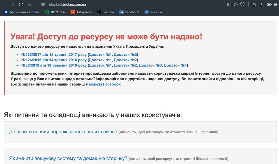 Следует отметить, что решение о блокировке было принято на основании указа Президента Украины от 15 мая 2017 года, который предусматривает блокирование таких российских информационных ресурсов, как VK, Yandex, Webmoney, Mail.ru и других.