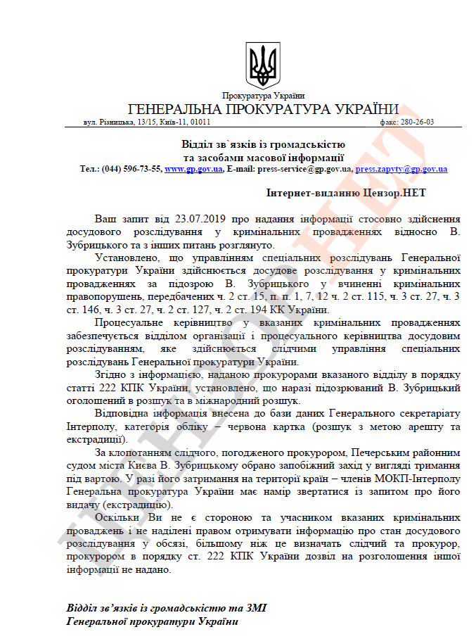 Также ГПУ сообщила, что подозреваемый Зубрицкий объявлен в розыск и в международный розыск.