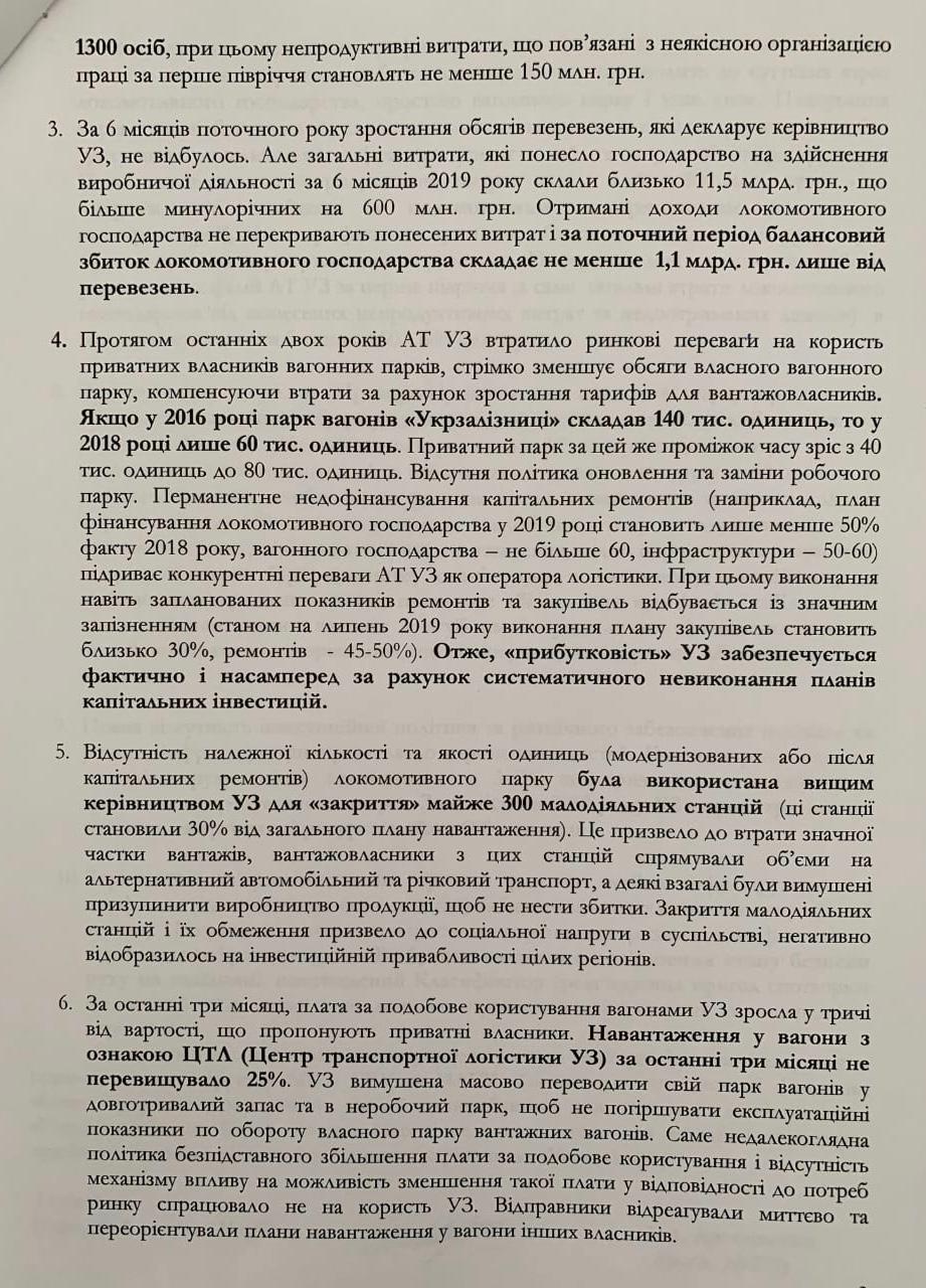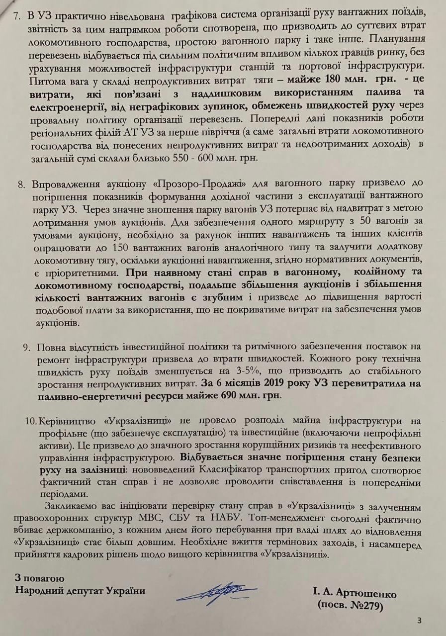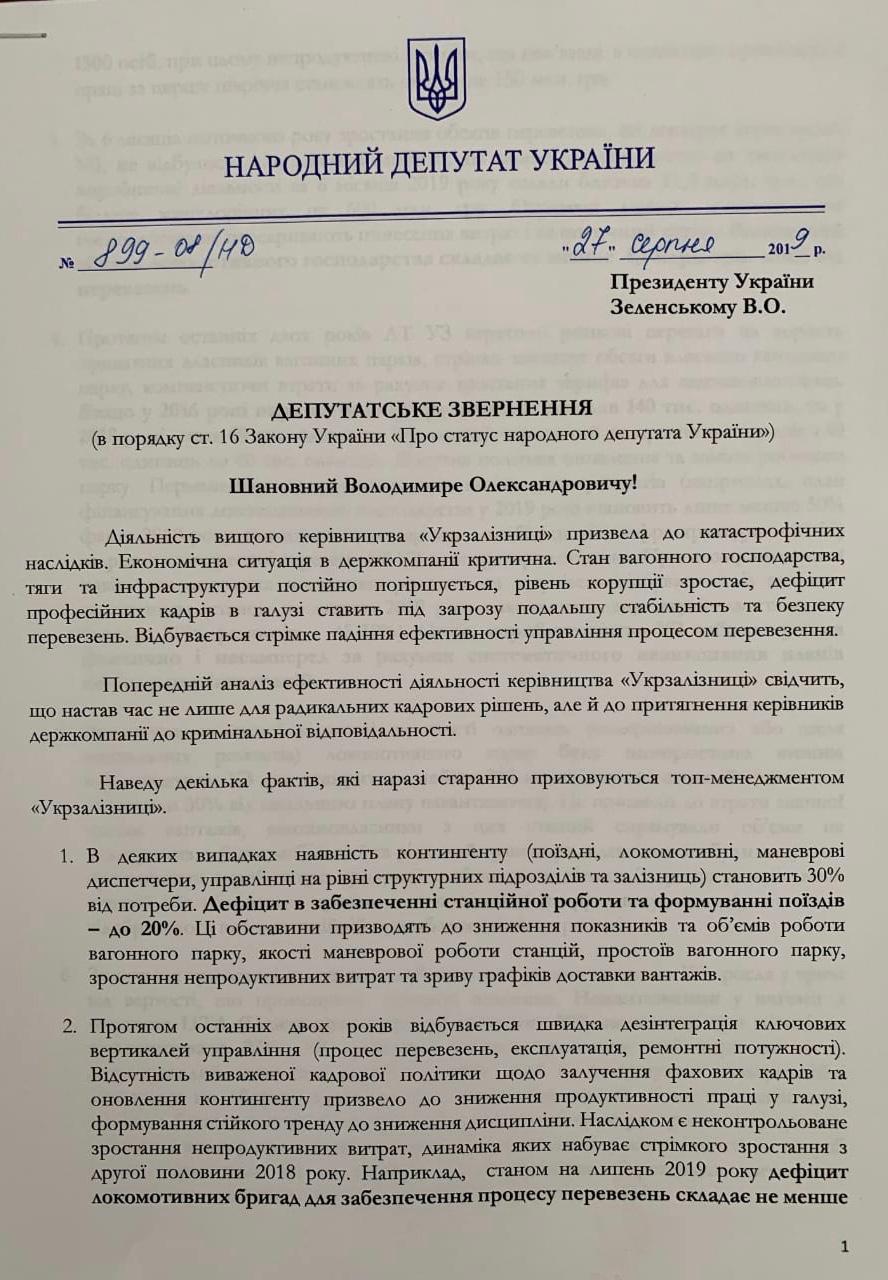 "Анализ эффективности деятельности руководства "Укрзализныци" свидетельствует, что настало время не только для радикальных кадровых решений, но и для привлечения руководителей госкомпании к уголовной ответственности. Призываем вас инициировать проверку состояния дел в "Укрзализныце" с привлечением правоохранительных структур МВД, СБУ и НАБУ. Топ-менеджмент сегодня фактически убивает госкомпанию, с каждым днем его пребывания у власти путь к восстановлению "Укрзализныци" становится более длинным. Необходимо применение срочных мер и, прежде всего, принятие кадровых решений относительно высшего руководства "Укрзализныци", – говорится в обращении нардепа 8 созыва к президенту.