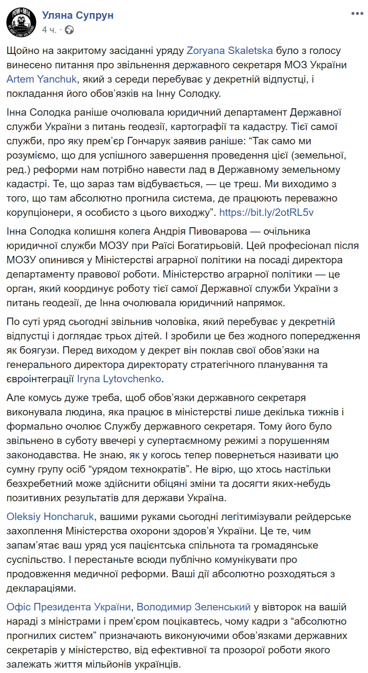 "Только что на закрытом заседании правительства Зоряна Скалецкая подала вопрос об увольнении государственного секретаря Министерства здравоохранения Украины Артема Янчука, который со среды находится в декретном отпуске, и возложение его обязанностей на Инну Солодкую. По сути правительство сегодня уволило мужчину, который находится в декретном отпуске и ухаживает за тремя детьми и сделали это без какого-либо предупреждения, как трусы", - говорится в сообщении.