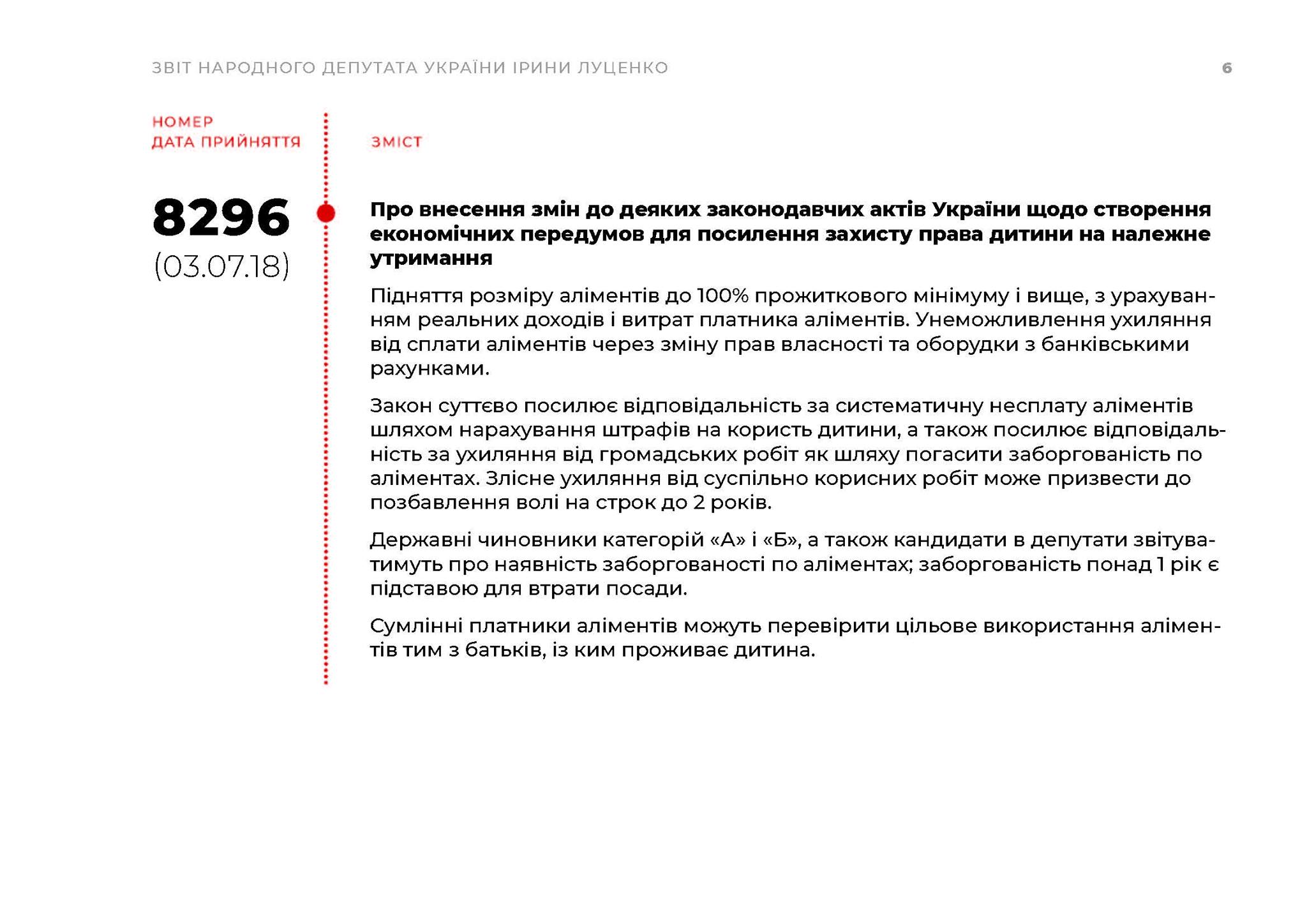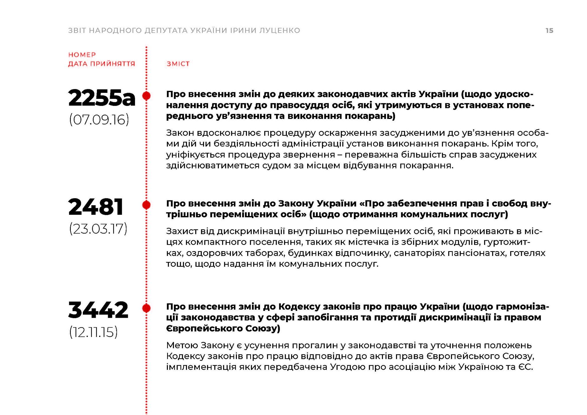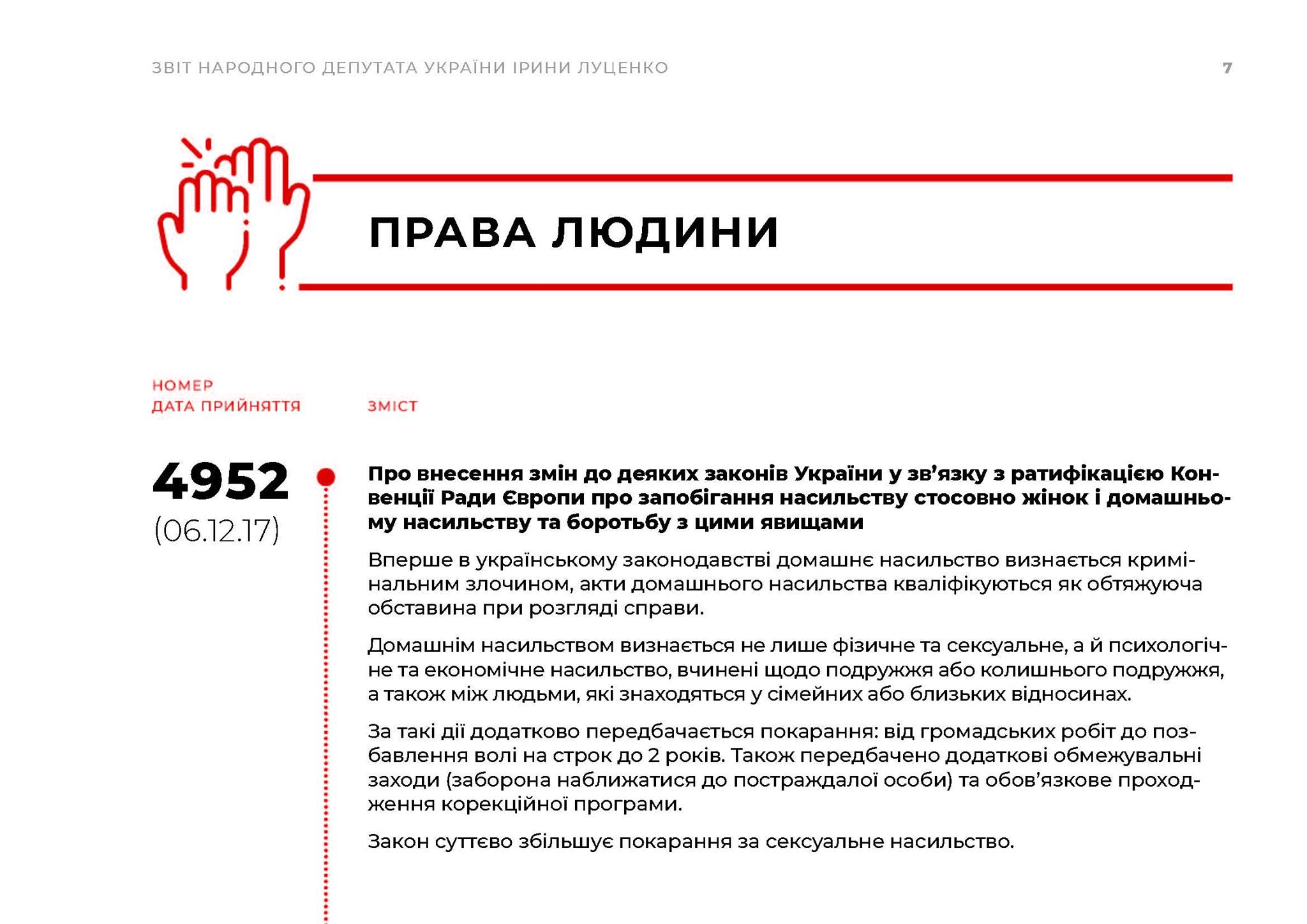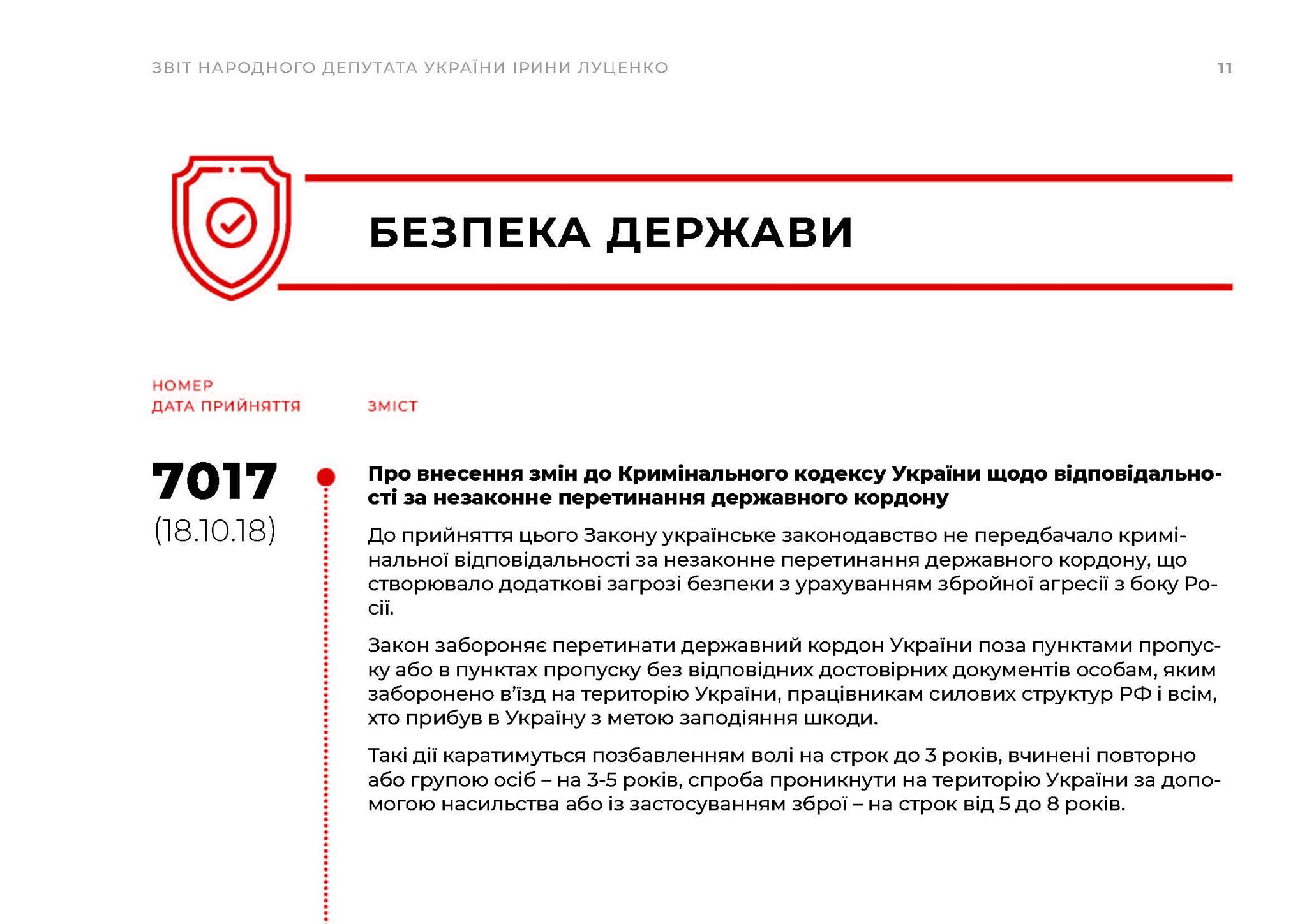 "Я всегда рассматривала депутатский мандат как большую ответственность и возможность приобщиться к развитию страны. Своей основной миссией видела защиту детей и украинских семей, борьбу с домашним насилием, защиту прав человека. Впервые в украинском законодательстве появилось такое понятие, как домашнее насилие. Впервые оно признано уголовным преступлением. Впервые родители, которые забыли о существовании собственных детей, выплатили в их пользу более 8 млрд гривен алиментов. Созданное мною МФО "Чужих детей не бывает" объединило десятки депутатов с одной целью - создать условия для безопасного и всестороннего развития ребенка. Вместе нам удалось принять много важных законов. Приоритетом моей работы в качестве народного депутата также была защита государственного суверенитета Украины. Впервые был запрещен доступ на выборы наблюдателям государства-агрессора. Впервые незаконное пересечение государственной границы Украины признано уголовным преступлением. Впервые в Конституции Украины закреплен курс евроатлантической интеграции, наше стремление приобрести полноправное членство в ЕС и НАТО. Это лишь основное из того, что успела сделать", - рассказала Луценко.