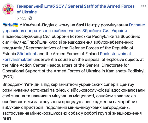 "В конце мероприятия представители Сил обороны Эстонской Республики и Вооруженных сил Финляндии поблагодарили руководство и личный состав Центра разминирования за теплый прием, возможность усовершенствовать уровень своих профессиональных знаний, особенно за возможность изучить боевой опыт украинских военных саперов", - добавили в пресс-службе Генштаба.