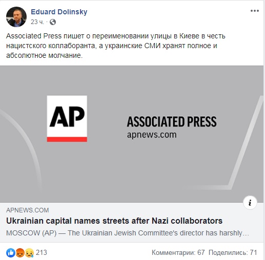 Отметим, что Долинский уже удалил свое сообщение и опубликовал другое - с извинениями - в котором опять обвинил власти, что "остаются в Киеве и улицы других нацистских коллаборантов".