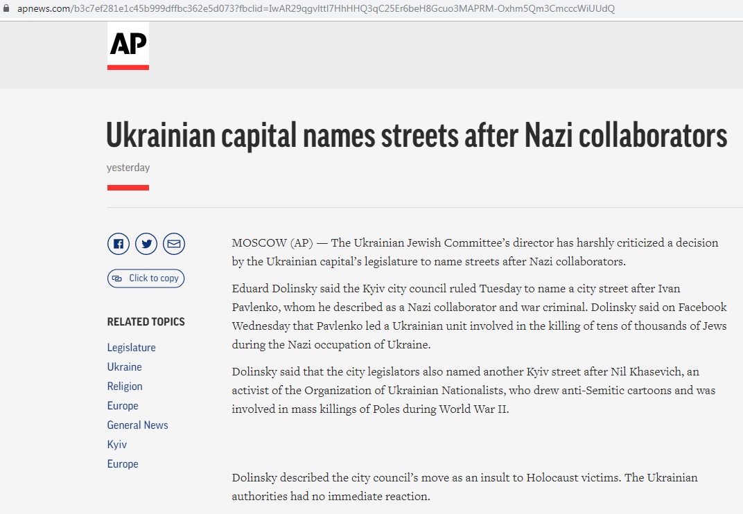 The Associated Press, издание The Washington Post и другие именитые мировые медиа распространили ложную информацию о том, что одну из улиц Киева якобы переименуют в честь украинского коллаборанта нацистов Ивана Павленко. На самом деле улицу назовут именем Виктора Павленко, который был генерал-хорунжим Армии УНР, и умер от голода в 1932 году.