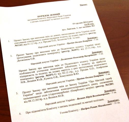 Комитет по вопросам налоговой и таможенной политики - самый многочисленный в парламенте этого созыва (33 депутата) и один из самых влиятельных. Однако повестка дня его заседания нигде не опубликована. Журналисты смогли сфотографировать ее.