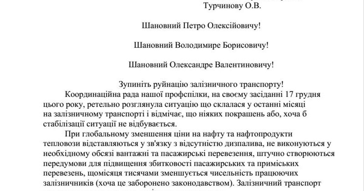 "При глобальном уменьшение цены на нефть и нефтепродукты тепловозы отставляются в связи с отсутствием дизтоплива, не выполняются в необходимом объеме грузовые и пассажирские перевозки, искусственно создаются предпосылки для повышения убыточности пассажирских и пригородных перевозок, ежемесячно, несмотря на запрет законодательства, уменьшается численность работающих железнодорожников. Железнодорожный транспорт перестает выполнять свое социальное назначение", - говорится в обращении.