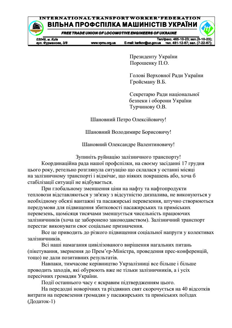 Свободный профсоюз машинистов Украины обратился к Президенту, председателю Верховной Рады и Секретарю СНБО с просьбой остановить разрушение железнодорожной отрасли, нарастание социальной напряженности в государстве и привлечь виновных в развале железнодорожного транспорта к ответственности.