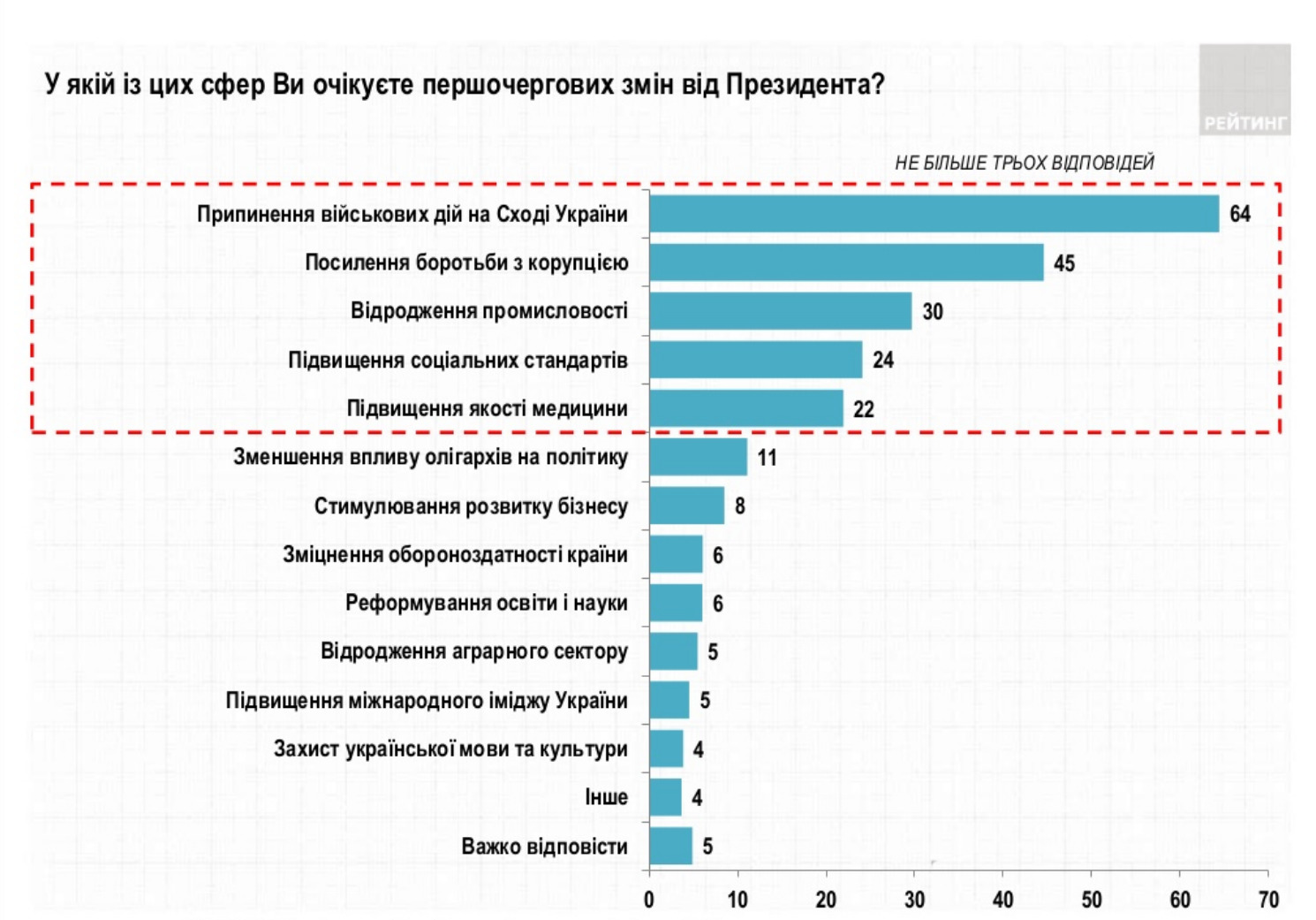 64% украинцев ожидают от Зеленского прекращения войны на Донбассе, 45% - усиления борьбы с коррупцией, - опрос "Рейтинга". ИНФОГРАФИКА
