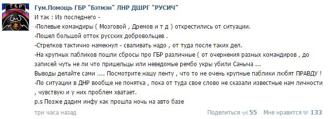 "Я не пытался бороться за власть в Новороссии и оставил свой пост в том числе для того, чтобы избежать подобных ситуаций. "Плетью обуха не перешибешь" - можно было только "дров наломать". Так что я призываю последовать тому, что сделал сам. В полном понимании, что иной вариант будет кровавый, бессмысленный и закончится трагически". - написал он, обращаясь, вероятно, к другим боевикам, приехавшим в Донбасс из России, чтобы сражаться против ВСУ.