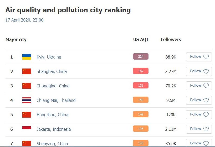 В пятерку рейтинга, кроме Киева, также вошли китайские Шанхай, Чунцин и Ханчжоу, а также тайский Чиангмай. Отметиим, что качество воздуха в этих городах в два раза лучше, чем в Киеве.