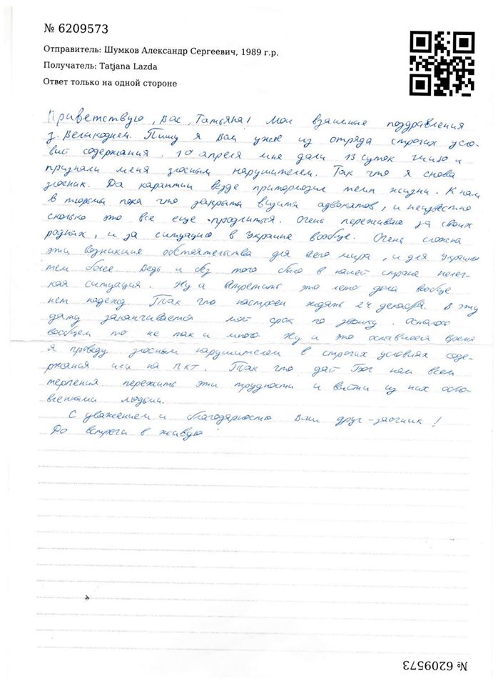"Пишу я вам уже из отряда строгих условий содержания. 10 апреля мне дали 13 суток ШИЗО и признали меня злостным нарушителем. Так что я снова злостник", - написал Шумков.