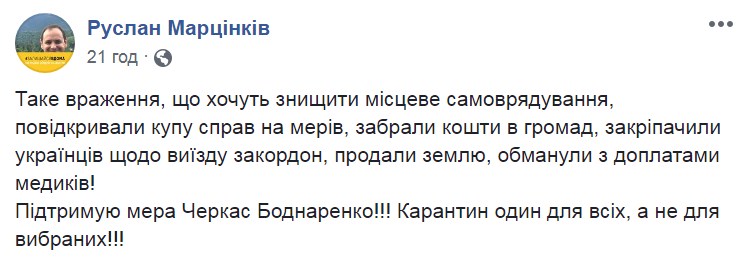"Такое впечатление, что хотят уничтожить местное самоуправление, открыли кучу дел на мэров, забрали средства у громад, закрепостили украинцев относительно выезда за границу, продали землю, обманули с доплатами медикам! Поддерживаю мэра Черкасс Боднаренко!!! Карантин один для всех, а не для избранных!!!", - написал Марцинкив.