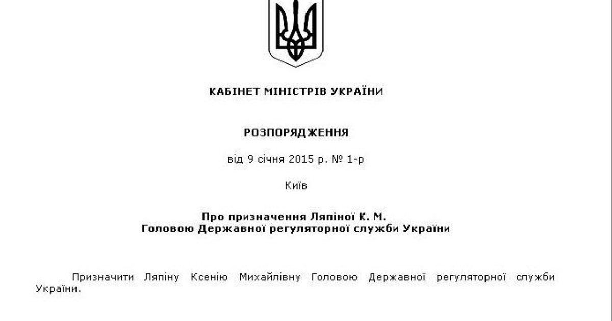 "Назначить Ляпину Ксению Михайловну Главой Государственной регуляторной службы Украины", - сказано в документе.