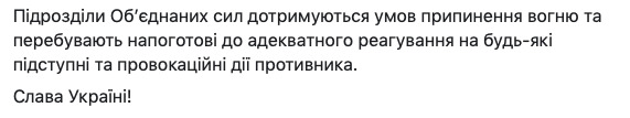 "Решительными действиями и эффективным применением дежурных огневых средств наши воины прекратили враждебные обстрелы. Захватчики получили адекватный ответ от Объединенных сил", — добавили в штабе.