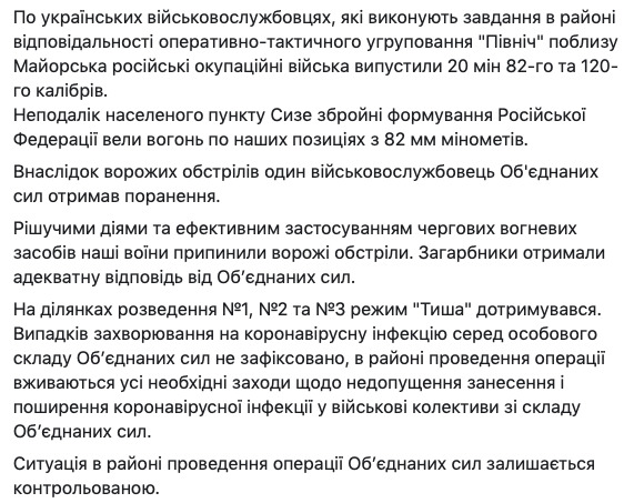 "Вследствие вражеских обстрелов один военнослужащий Объединенных сил получил ранения", — сказано в сообщении.