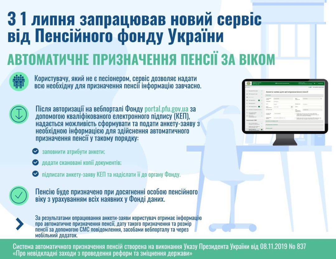 "С 1 июля Пенсионный фонд Украины внедрил новую сервисную услугу - автоматическое назначение пенсии. Пенсия назначается автоматически при достижении пенсионного возраста. При этом нет необходимости дополнительно обращаться и лично посещать органы Пенсионного фонда", - говорится в сообщении.