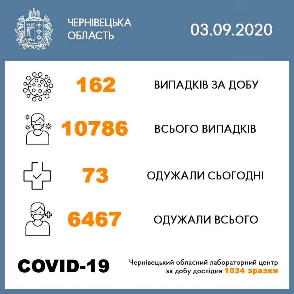 За минувшие сутки, 3 сентября, в Черновицкой области обнаружили 162 больных коронавирусной болезнью.