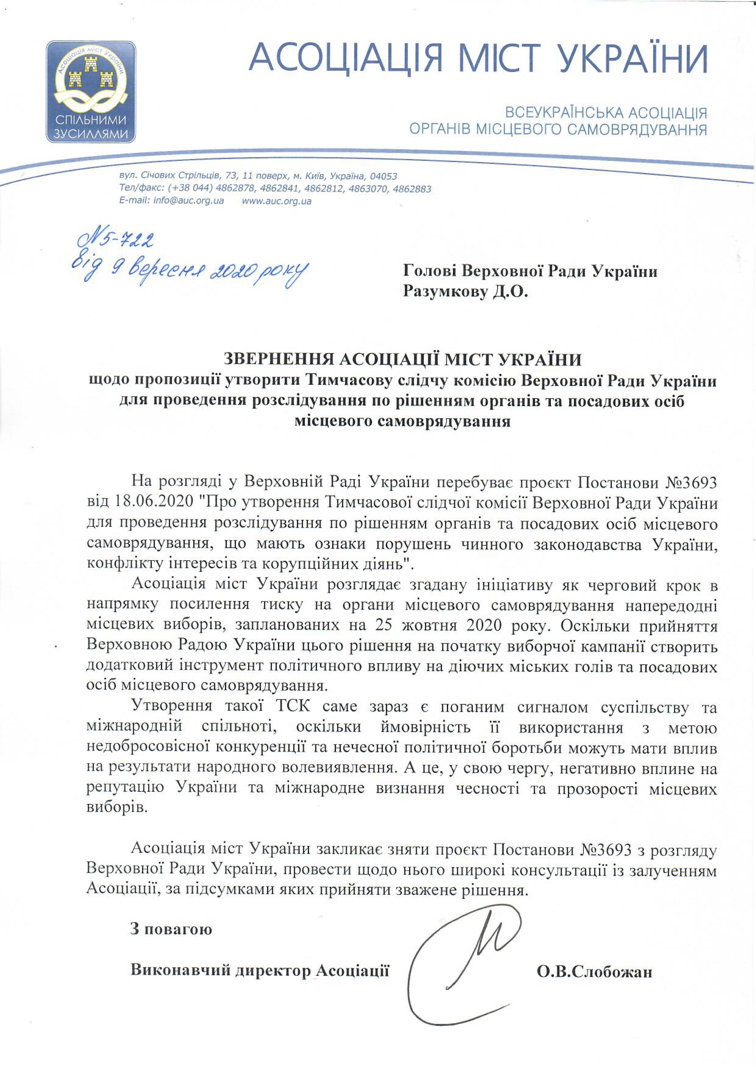 Ассоциация городов Украины обратилась к Председателю Верховной Рады и председателям депутатских фракций, групп в Верховной Раде Украины с просьбой снять проект Постановления №3693 с рассмотрения Верховной Рады Украины, провести относительно него широкие консультации с привлечением Ассоциации, по итогам которых принять решение.