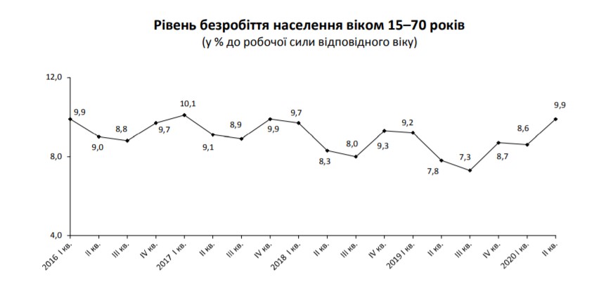 Таким обрахом, согласно данным Госстата, уровень безработицы во II квартале 2020 года относительно рабочей силы среди лиц от 15 до 70 лет вырос с 8,6% до 9,9%, или 1,7 млн человек.