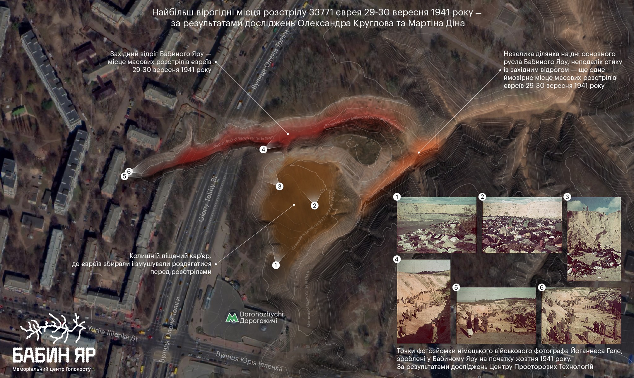Карту мест расстрелов смотрите по ссылке. 3D-модель Бабьего Яра 1941 уже сейчас можно посмотреть на сайте Мемориального центра.