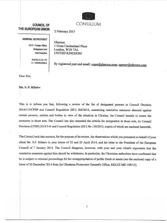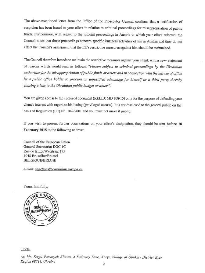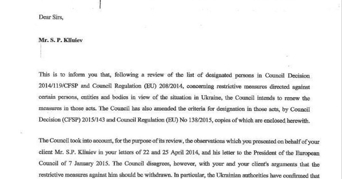 В письме говорится о том, что Совет ЕС намерен оставить в действии санкции в отношении Сергея Клюева с формулировкой о незаконном присвоении государственных средств и использовании служебного положения с целью получения неправомерной выгоды для себя или третьих лиц.