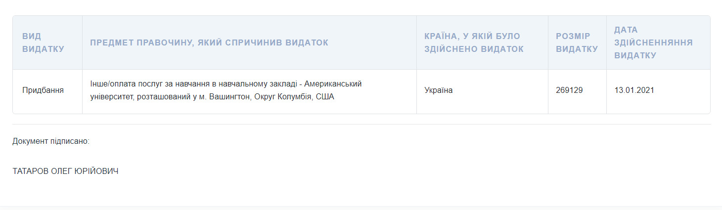 В документе указано, что 13 января Татаров оплатил обучение стоимостью 269 129 грн в Американском университете в Вашингтоне, округ Колумбия, США.