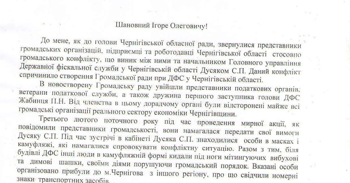 Кроме того, предпринимателей поддержало и руководство области. Глава Черниговского областного совета Николай Зверев, а также и.о. главы областной администрации Сергей Журман направили письма председателю Государственной фискальной службы Украины Игорю Белоусу с требованием освободить от занимаемой должности господина Дусяка, чтобы не дестабилизировать ситуацию в области.