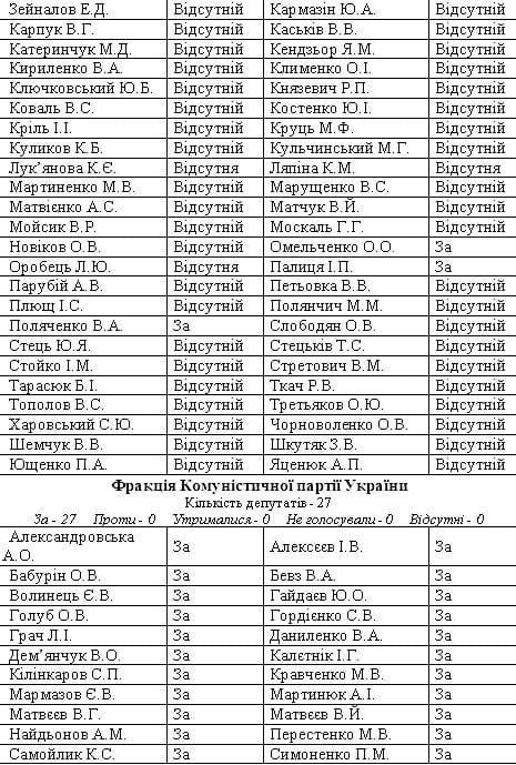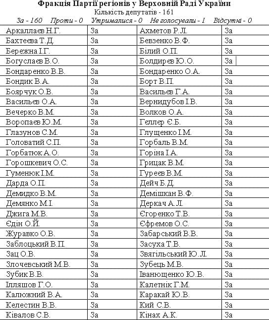 - "Партия регионов" в полном составе (160 "за" и один отсутствует),