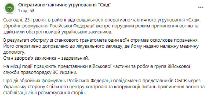 "В результате обстрела со станкового гранатомета один воин получил осколочное ранение. Его оперативно доставили в лечебное учреждение, где ему предоставили надлежащую медицинскую помощь. Состояние здоровья защитника - удовлетворительное", - отмечается в сообщении.