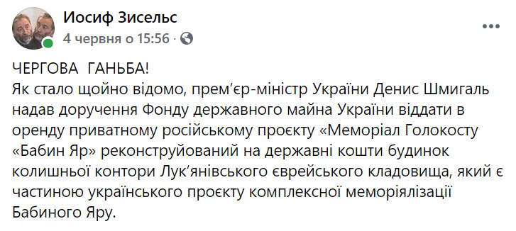 "ОЧЕРЕДНОЙ ПОЗОР! Как стало только что известно, премьер-министр Украины Денис Шмыгаль дал поручение Фонду государственного имущества Украины отдать в аренду частному российскому проекту "Мемориал Холокоста "Бабий Яр" реконструированное на государственные средства здание бывшей конторы Лукьяновского еврейского кладбища, которое является частью украинского проекта комплексной мемориализации Бабьего Яра", - написал он.