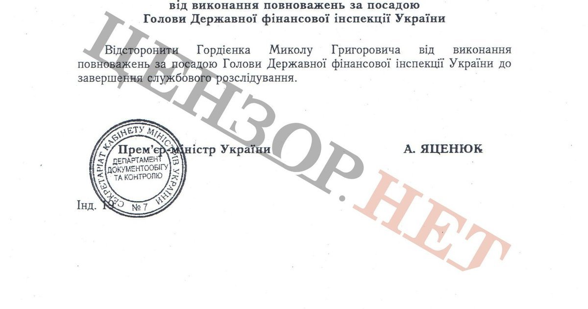 В распоряжении Цензор.НЕТ оказались документы, подтверждающие отстранение Гордиенко от занимаемой должности и проведение служебного расследования относительно ненадлежащего исполнения служебных обязанностей.