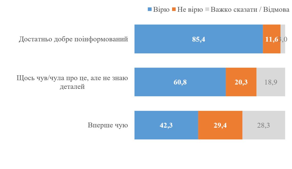 "При этом, независимо от того, знали или нет до интервью респонденты об этом расследование, 56,9% респондентов верят, что Владимир Зеленский и его бизнес-партнеры обладают офшорными счетами за рубежом, а Игорь Коломойский якобы выводил средства из "ПриватБанка", в том числе через "95 квартал". Не верят в это 22,6% респондентов. Среди тех, кто "впервые слышит", 42,3% верят в причастность В. Зеленского / "95 квартала" к офшорным счетам и выводу средств (не верят - 29,4%). Вместе с тем, среди тех, кто хорошо информированных верят 85,4% (не верят - 11,6%), а среди тех, кто только кое-что слышал - 60,8% (не верят - 20,3%)", - отмечают авторы исследования.