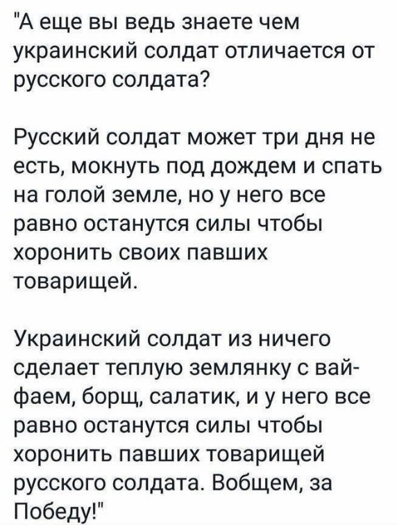 Кто-то из древних сказал, «Тот, кто предупрежден, тот вооружен!». Да, именно так! Спасибо за предупреждение. Хотя… Мы, собственно, и без вас ЭТО знали. Мы прекрасно знаем, что пока рядом с Украиной существует россия в нынешнем своём формате, «голожопая, пьяная, нечёсаная… но с ракетой в девять махов», угроза войны будет ВСЕГДА! Пока Украина будет всем своим видом показывать, что она стремится к цивилизации, а не к скрепам со складным крестиком на митре, чтобы за крышу «мерседеса» не зацепиться, угроза войны будет ВСЕГДА! Третьего не дано! Украина нужна россии в одном виде: стоящая под воротами кремля на коленях, в драном рубище, с протянутой рукой и цепью на шее. Да! Так и никак иначе видят отношения с Украиной там, на россии.