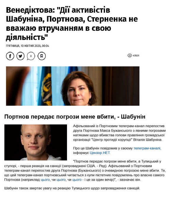 "Портнов передає погрози мене вбити, - Шабунін" "Венедіктова: "Дії активістів Шабуніна, Портнова, Стерненка не вважаю втручанням в свою діяльність"