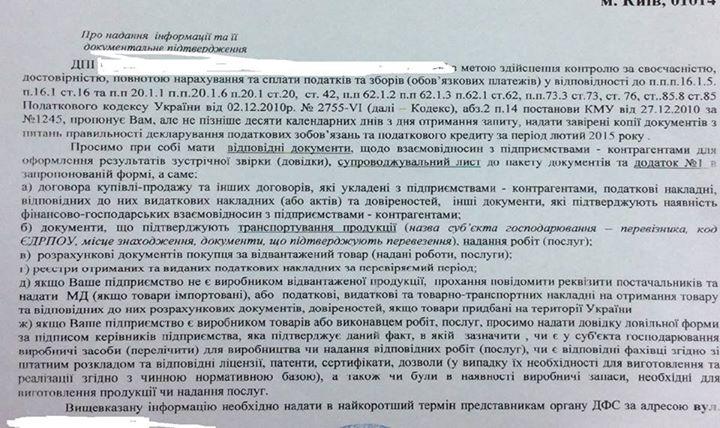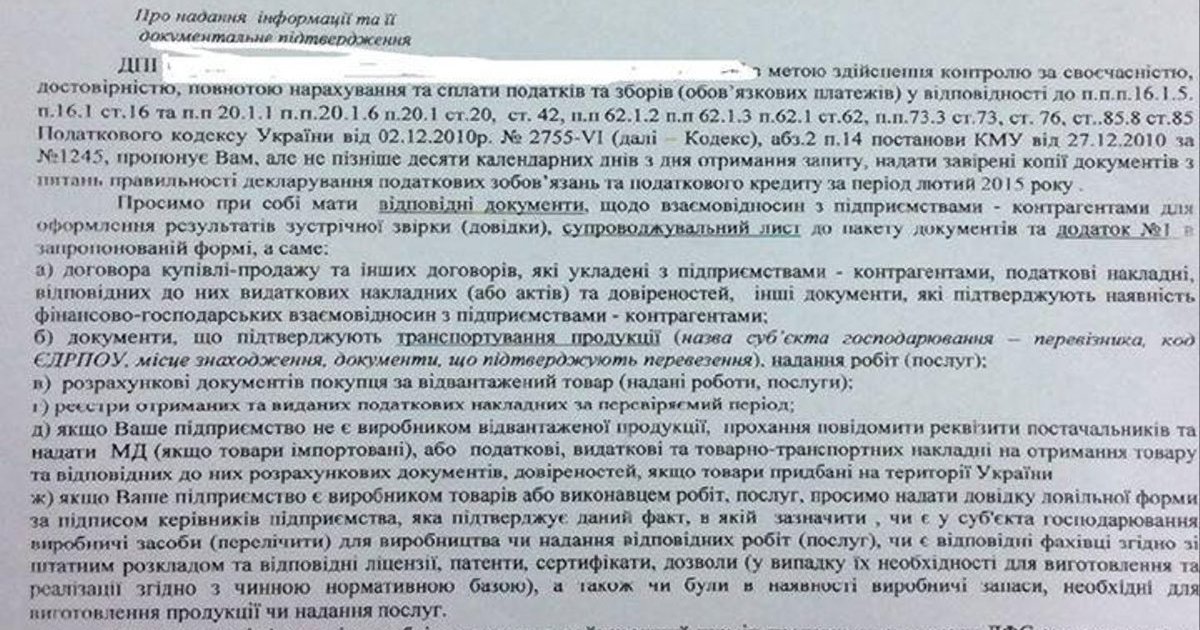 Фискальные органы посчитали крайне подозрительным, что в этой стране может запускаться новый производственный бизнес, что могут создаваться новые рабочие места, поэтому сразу за сдачей отчетности за первый месяц полноценной работы (февраль) последовал вызов в налоговую милицию, "непонятные" разговоры с руководством районной налоговой милиции, что бизнес подозрительный и вручение такого незаконного, противоречащего, как минимум 3 нормам Налогового Кодекса и четырем нормам нормативных актов запроса. Из этого запроса невозможно понять нужно ли вести большую часть бухгалтерии в оригиналах или ее ксерокопировать? Если это встречная проверка, то с кем? И если требуется такой объем документов зачем фискалам электронные налоговые накладные?
