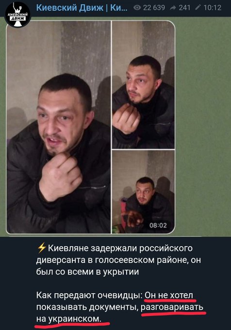 Він переховувався в укритті разом з киянами і не хотів ( бо не може ) говорити українською мовою.