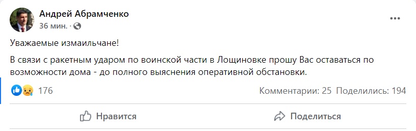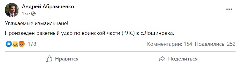 "Уважаемые измаильчане! Совершен ракетный удар по воинской части (РЛС) в селе Лощиновка", - говорится в сообщении.