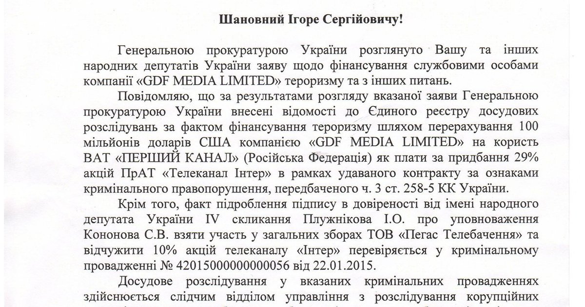 Генеральная прокуратура также проверяет факт подделки подписи в доверенности от имени народного депутата Верховной Рады ІV созыва Игоря Плужникова относительно отчуждения акций телеканала "Интер".