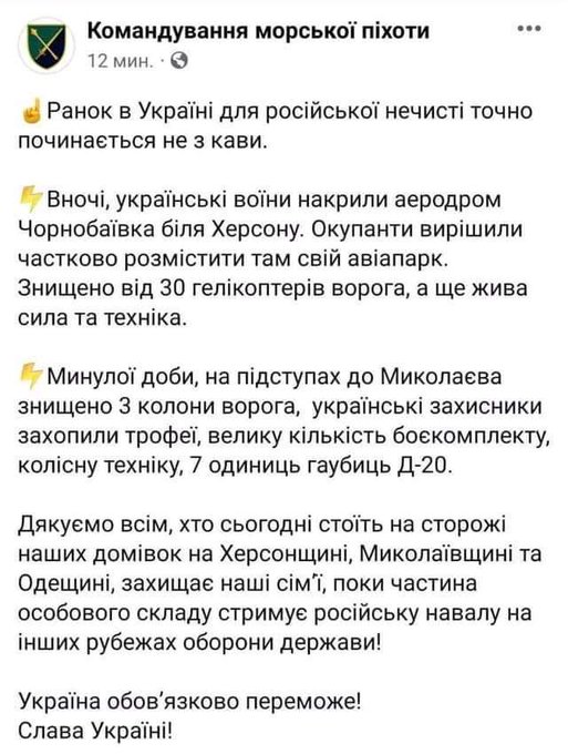 Идут двенадцатые сутки героического противостояния Украинского народа русскому военному вторжению. Противник продолжает наступательную операцию против Украины, сосредотачивая основные усилия на окружении Киева, Харькова, Чернигова, Сум, Мариуполя, Николаева. Не оставляет попыток выйти на административные границы Луганской и Донецкой областей.