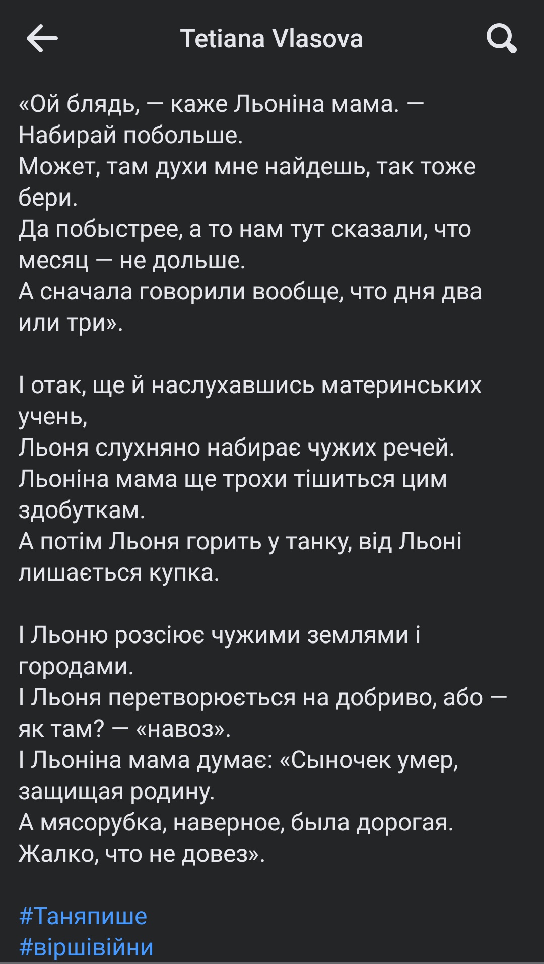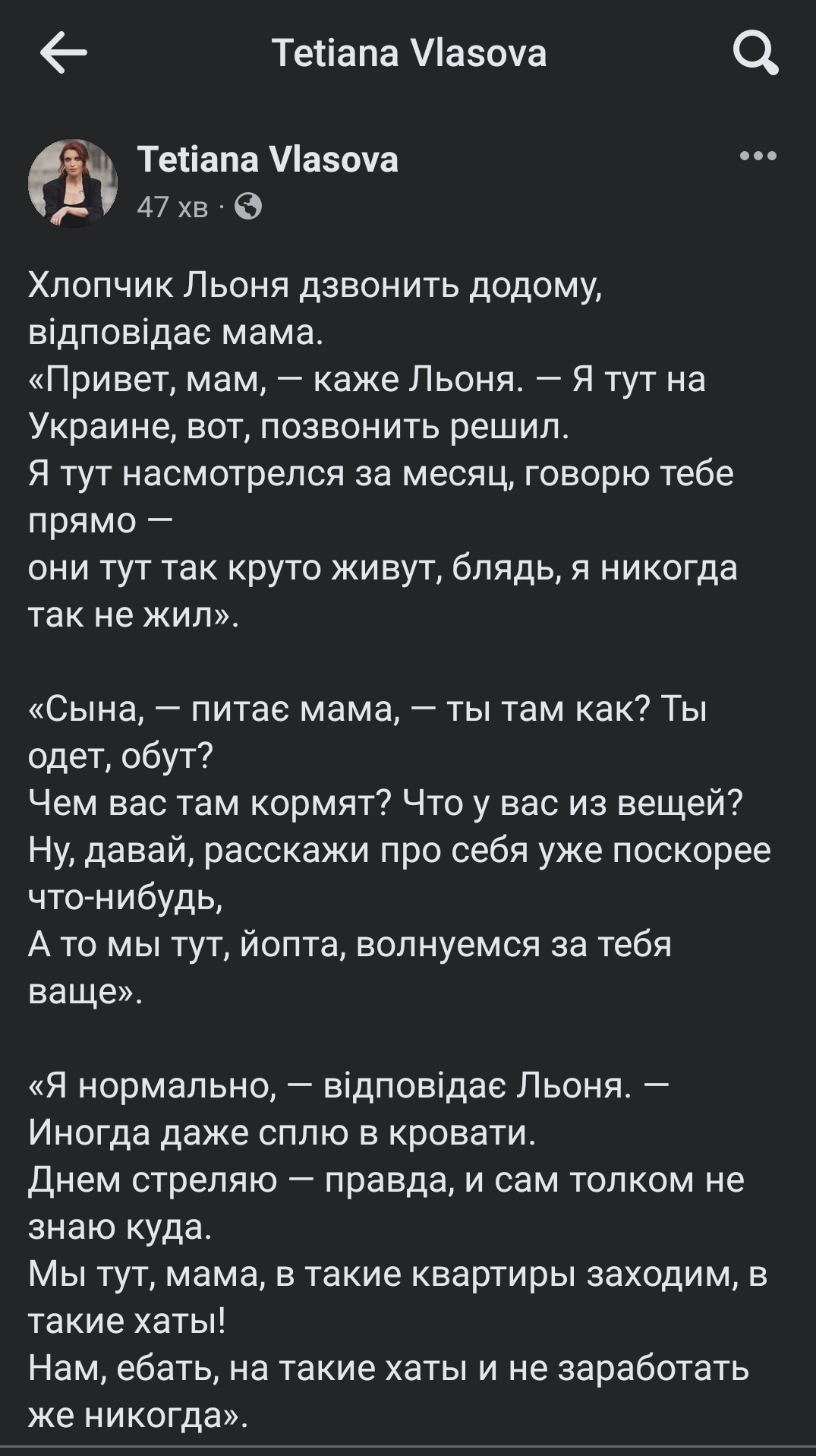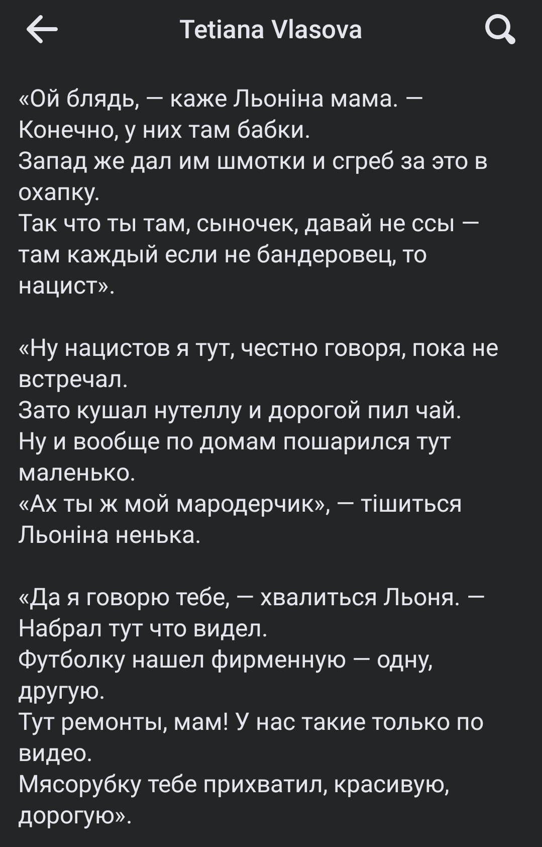Из перехваченных СБУ звонков русских военных домой - Дорогая, зайченок!- Да!- Мы теперь разбогатеем.- А че, ты аграбил праклятых нацистских хахлов? - Нет, я буду петь на сцене как Робертино Лоретти. У меня после жизни в окопах рыжего чернобыльского леса прорезался тонкий мальчишечьий голос. Правда, отсохли и отвалились яйца.