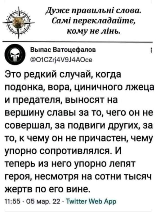 А що тепер,коли руський мір показав себе насправді як є, вже танки ЗСУ зустрічають зі сльозами і радістю, в країні майже незалишилось хто за руський мір, але своїми такими діями проросійськими і накликали біду на нашу Україну.