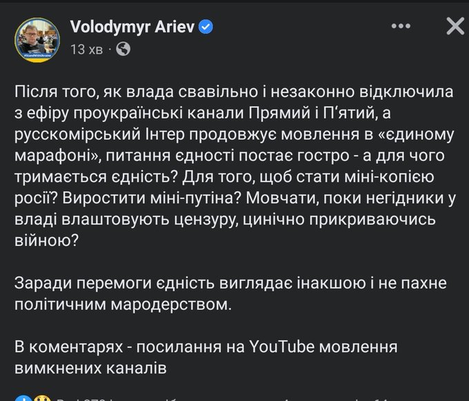 Справді, на тому єдиному каналі, який дозволяє влада, є лише Зеленський, Єрмак, Данілов, Арестович, Подоляк та усілякі Арахамії)