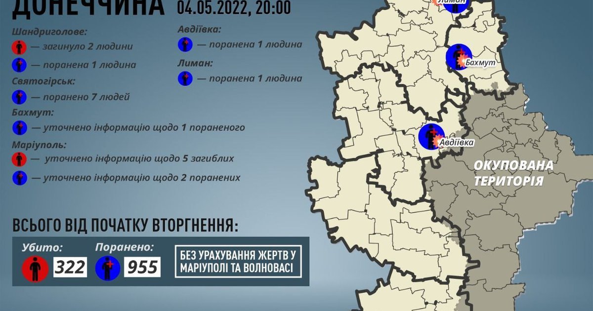 "4 мая россияне убили 2 мирных жителей Донбасса – в Шандриголовом. Еще 11 человек в области сегодня получили ранения. Удалось уточнить информацию о 5 погибших и 2 раненых в Мариуполе, однако точное количество жертв в Мариуполе и Волновахе установить пока невозможно. Каждый военный преступник будет наказан!", - говорится в сообщении.