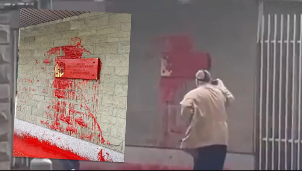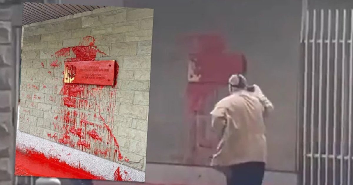 На опубликованном видео видно, как мужчины подходят к воротам посольства и заливают красной краской табличку на одном из зданий и окно.