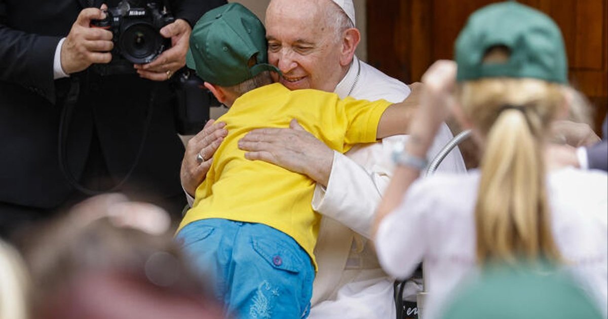 "Я хотел бы поехать в Украину, но должен ждать подходящего момента", - сказал Папа, отвечая на вопрос украинского ребенка на встрече с группой молодых людей, которая состоялась во дворе Сан-Дамасо.