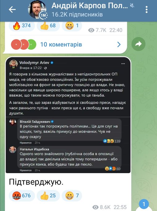 А починалось з того, що Люська і Данілов вихваляли рашистську орду за розум і професійність, УПячка закликали "не демонізувати" рашистів і зняли Денисову, а тепер "ху*як по піаніно", всі українці -панікери і сикуни.