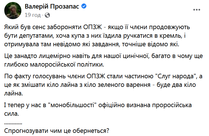 Дано: Партію "ОПЗЖ", у котрій виявилася значна частина колаборантів, заборонили.