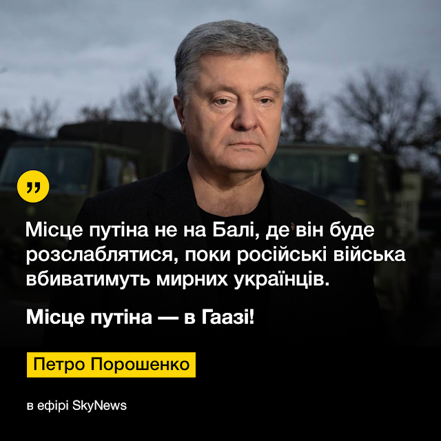 "Не найдется в мире ни одной нации, которая хотела бы мира больше, чем мы, украинцы. Но найти компромисс невозможно по очень простой причине. Путин хочет нас убить, а он убивал украинцев восемь лет войны, начиная с 2014 года. А мы, украинцы, хотим жить, наши дети, наши женщины хотят жить. Путин хочет стереть Украину с карты мира, а мы хотим жить в своей стране", - говорит Порошенко.