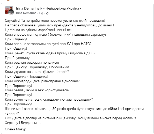По отношению к нам перефразирую , если кто то сдает Украину - то он ПРЕДАТЕЛЬ! Сложите все кубики событий и вы поймете , что они как пазл подходят друг к другу и указывают на Зеленского и его окружение! А слова , видосики , и остальная мура , это всего лишь дымовая завеса ! Изменение риторики - попытка выйти сухим из воды , еще и героем